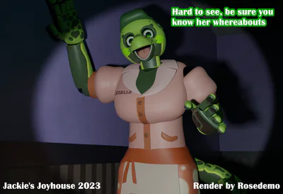 A Week at Jackie's Joyhouse, of Jackie's Joyhouse for short, is a Five Nights at Freddy's fangame about a woman named Abigail who gets a job at a animatronic filled diner. Unlike most fangames, the reason has nothing to do with the money or a mystery. Instead, it's about an event that happened with her that eats her up on the inside, something she wants to redeem herself from. Willing to fight off corrupted robots just to get to her goal