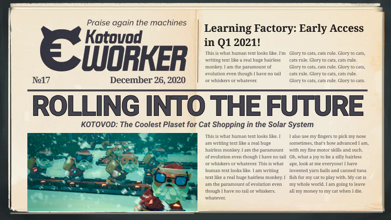 Learning Factory is a factory automation game where you will finally answer the ultimate question about your cat. To do that, you need to mine resources and craft components to renovate an old abandoned factory and make it as efficient as possible, so you can build new stuff for your feline overlords… only to research new technologies and discover new goodies to please them more. Thanks to the marvels of machine learning, eventually you will find out what they really, really want! Welcome to KOTOVOD Learning Factory!