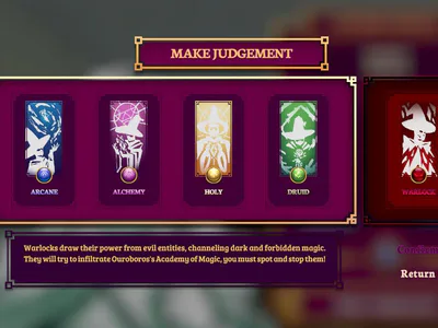 You play as a magical sorting hat for Ouroboros's Magic Academy and you have to decide which of the 4 Schools of Magic would be the best fit according to the applicants traits, interests and mana. For this demo, you have to play until the timer is out and having admitted at least 5 students correctly. Incorrectly guessing 3 times or having the time run out without that number of admitted students or letting a Warlock in by mistake will result in a gameover.Â