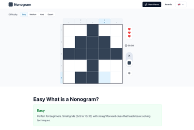 Nonogram Online is a free browser-based logic puzzle game where you reveal hidden pictures by filling in cells based on number clues.