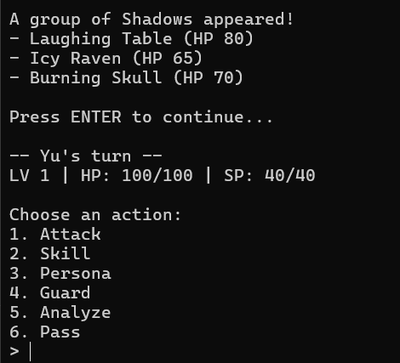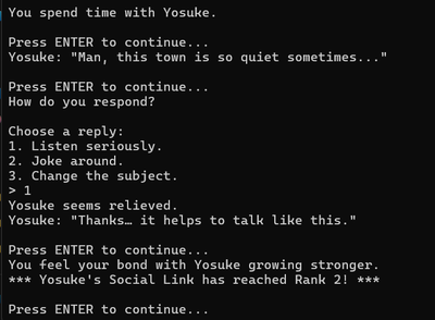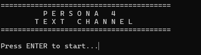 Persona 4 is a fantastic game that thousands still enjoy today... But what if we downscaled it, made it text-based, generated the code with Microsoft Copilot (a surprisingly good AI chatbot) and shoved it into Python? Well, let's hope for the best. This is an early version of the game. If there are any issues (Inventory, Persona switching etc.), please just comment below and I can shove it back into the chatbot. Thank you, and have fun with this weird (generated) creation!