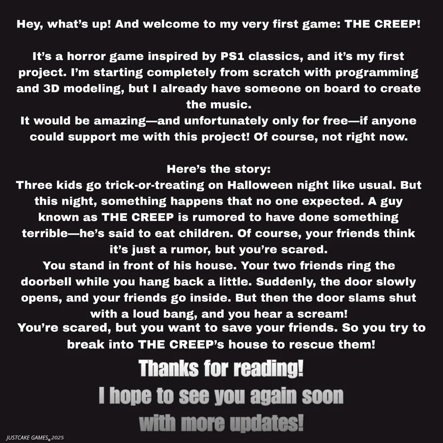 Three children go trick-or-treating on Halloween night, just like usual. But that night, something happens that no one expected. A guy known as THE CREEP is rumored to have done something terrible—he supposedly eats children. Of course, your friends think it's just a rumor, but you're still scared.