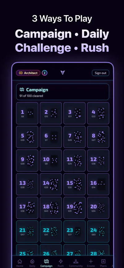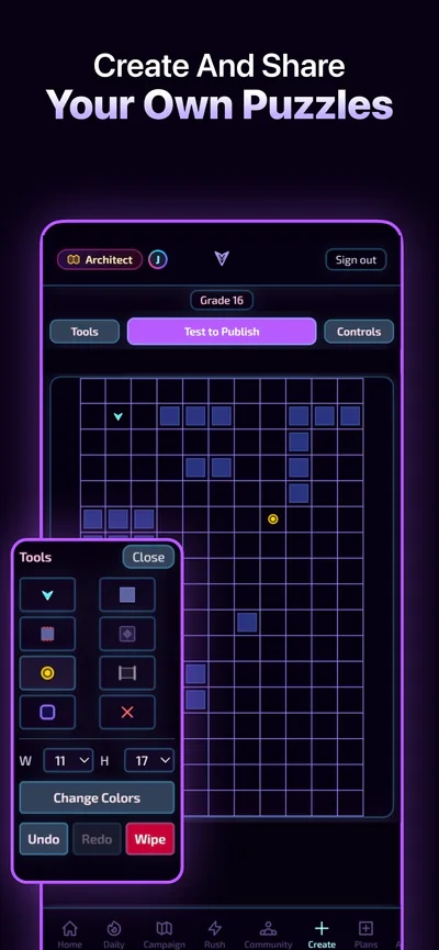 Game modes: Campaign (90+ hand-crafted levels), Puzzle Rush (3-minute timed challenge), Daily Challenge (leaderboards), Community (play and rate levels), Editor (design your own).