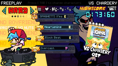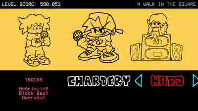 "VS. Chardery" is a Full Week, Friday Night Funkin' mod that was a remake of an old mod that I made back in 2021, "VS. Chardy." The mod is now on V-SLICE/BASE GAME engine with MOBILE SUPPORT along with it. Boyfriend take a stroll with his girlfriend at a square until he runs into a cubed guy named Chardery, or Chardy for short. He read in the newspapers about the blue-haired fella and was interested if he could sing with him. Boyfriend agreed and the two started singing with each other, hopefully concluding before a storm hits.