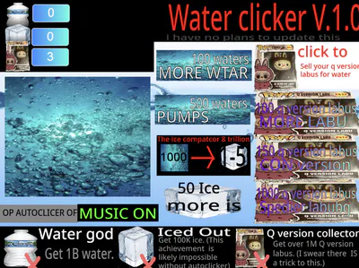 Click the big water to get small waters. Spend those waters on upgrades, such as more water per click, or pumps which make water for you. You gain 1 Q version labu each second. Spend Q version labus to get upgrades that increase Q version labu production, or cash them in for extra water. Eventually, build up enough water to turn it into ice. Use this ice to increase the amount of ice you get. Get as much ice as possible. TAKE OVER THE WORLD. FREEZE THE OCEANS. LEAVE NO SURVIVORS.