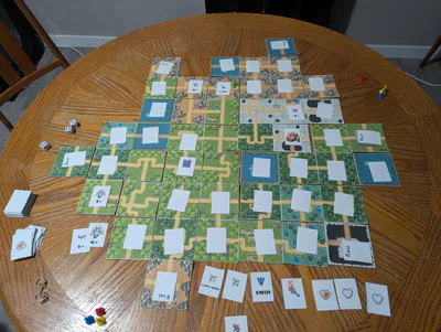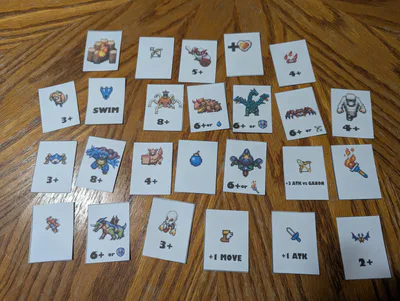 You'll find in the zip file a whole bunch of cards for enemies, items, and powerups as well as flippable heart meter cards and a whole set of terrain cards that you can use to build Hyrule differently each time! You'll need to print it all out and get some dice and meeples.
