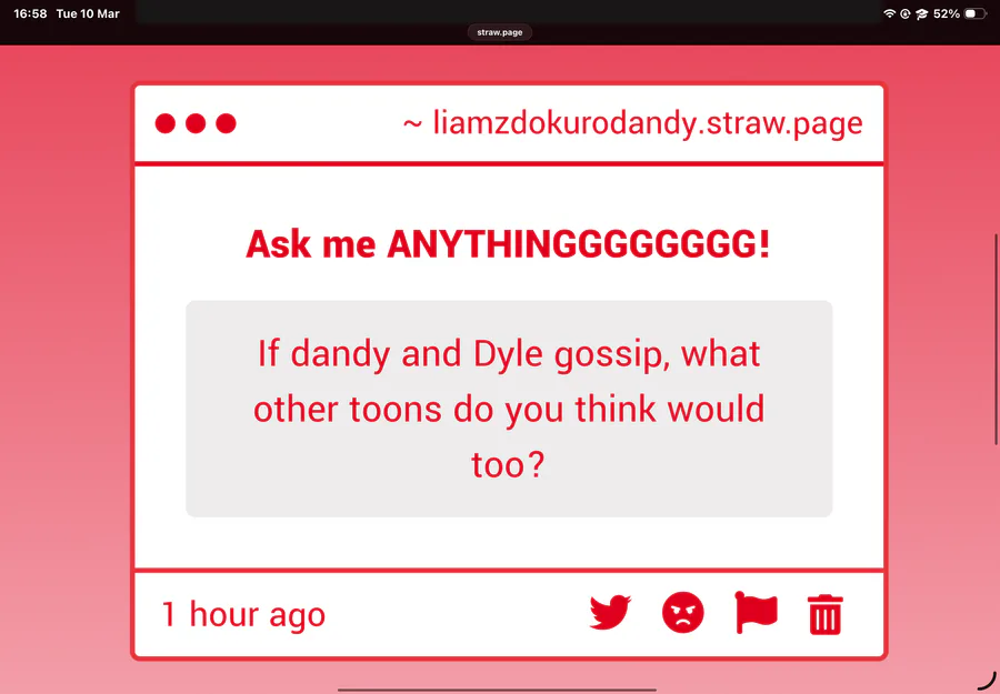 3. I think flutter, gigi and connie would probably all gossip together, seeing as i’m (pretty sure) they’re all friends! Glisten wud prolly gossip aswell, and i’d imagine there would most likely be alotta gossip inbetween all the toons in general- not all, but most :P