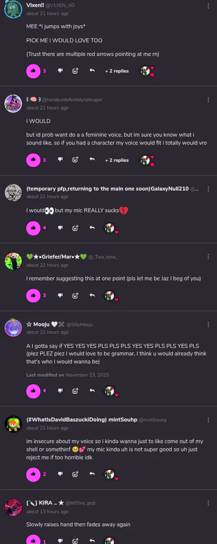 7 people asked for an audition, mar, mooju, and I are all actually gonna do it and I think suji too