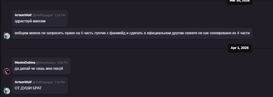 ахахахахахаххаха, ну я не прям так говорил ну ладн. ваще можете опять же рил че хотите с моими играми делать. помните я говорил что хочу ремейки сделать? так вот мне абсолютно лень, можете сделать это за меня, мб даже лучше выйдет :P