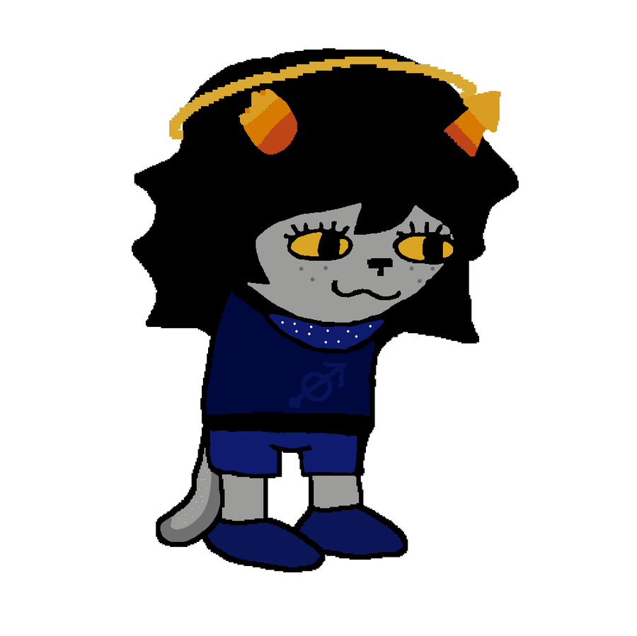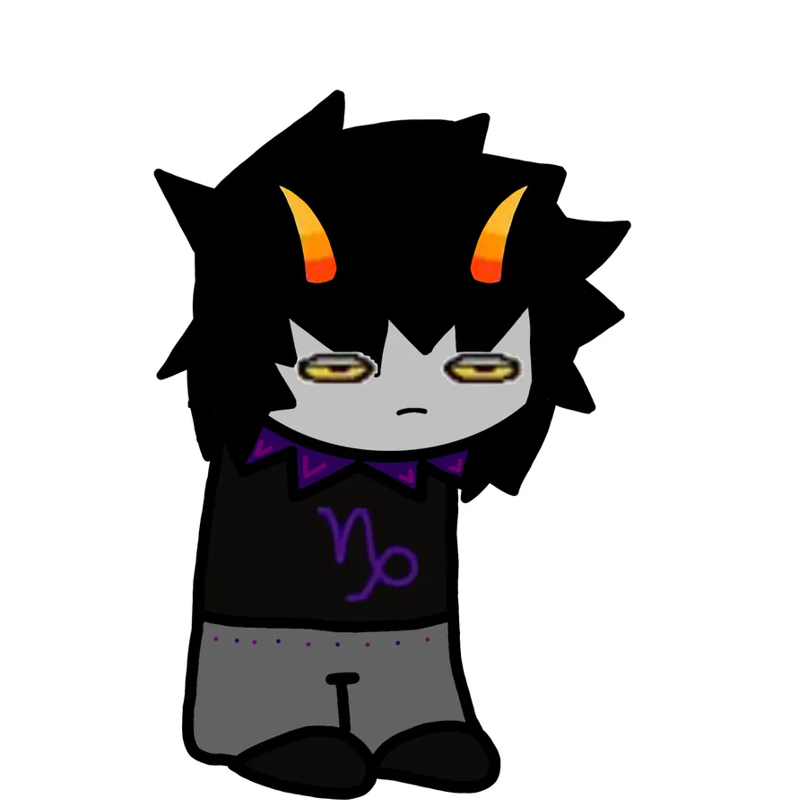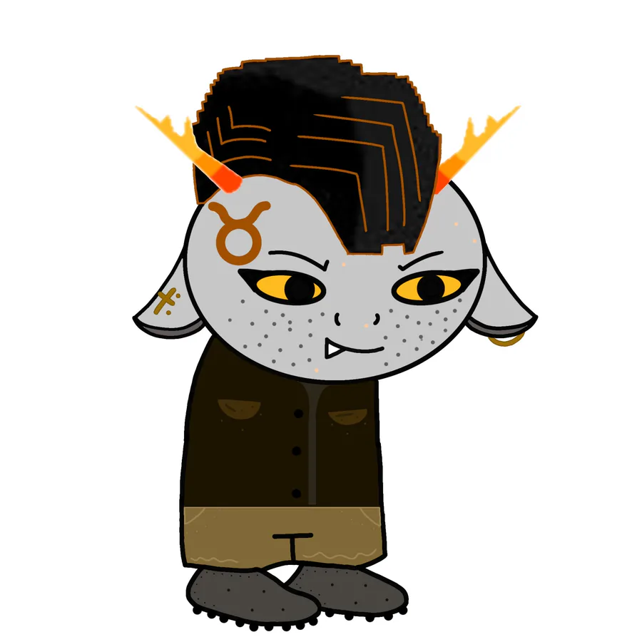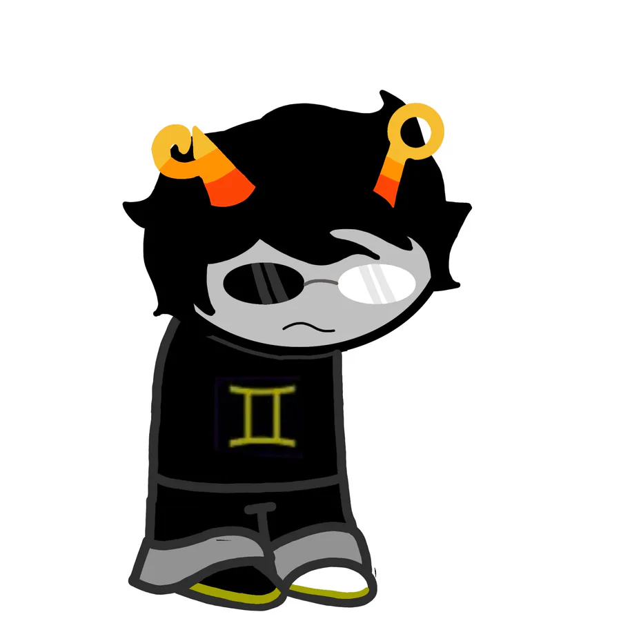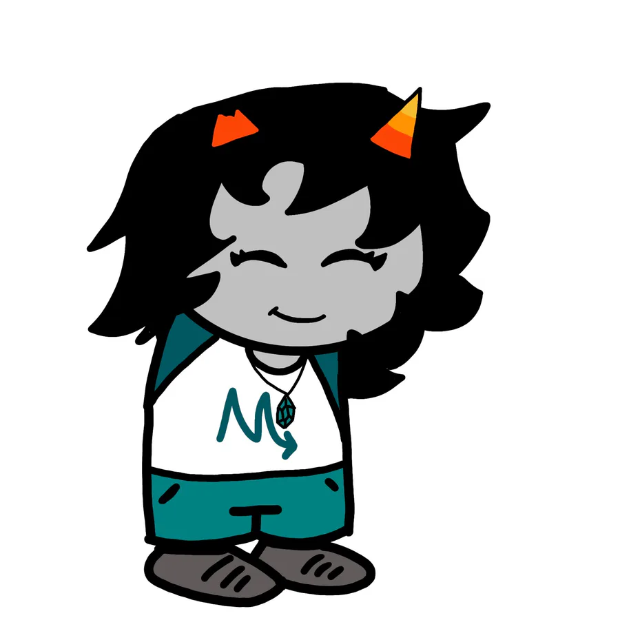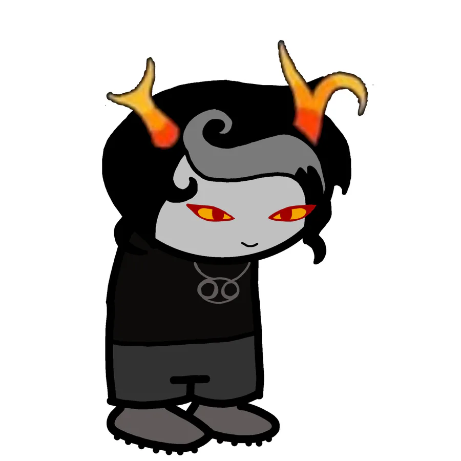 Looks: one cup horn and one bent horn, short black hair with a large grey streak in it, red and yellow eyes, content smile, necklace of the Signless (β), plain black shirt and plain grey shorts, plain grey shoes.