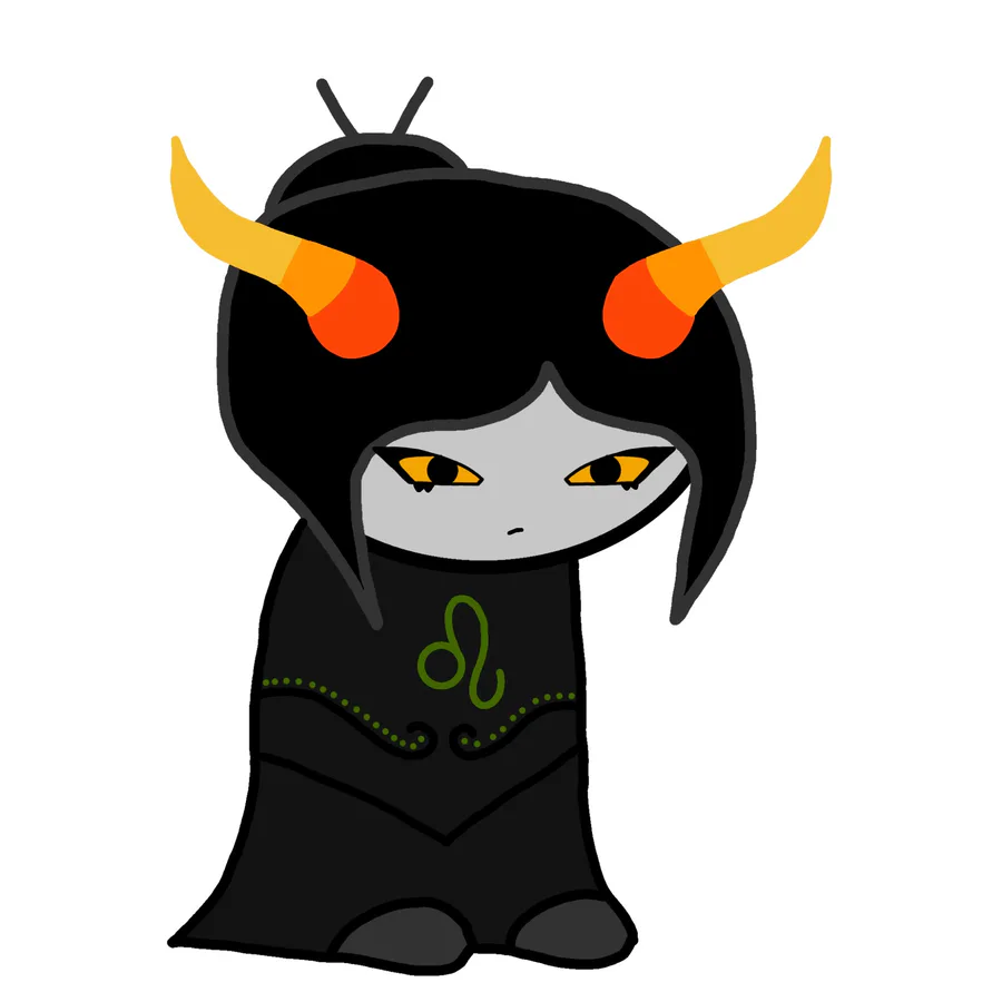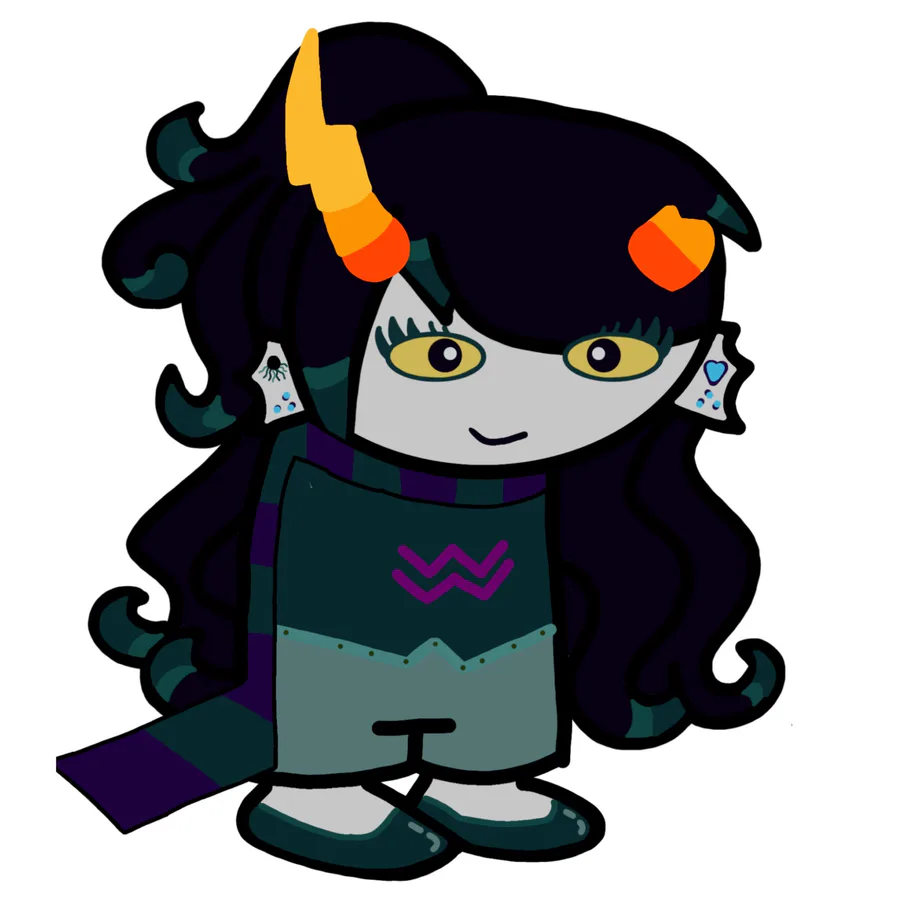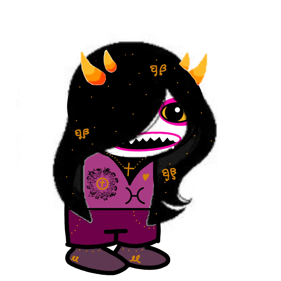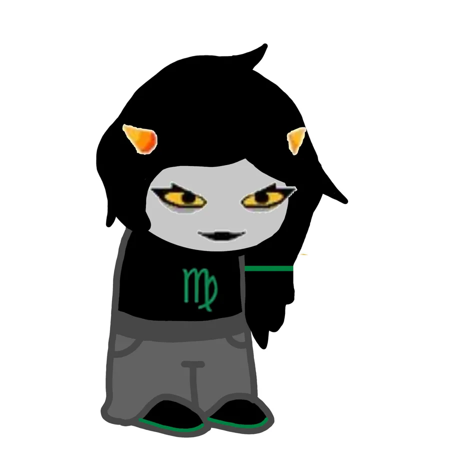 Looks: short black hair in a short ponytail, one horn to the side and one forked horn, has a black shirt with her β sign, grey pants, blacks shoes with red bottoms, red and yellow eyes, black lips, freckles.