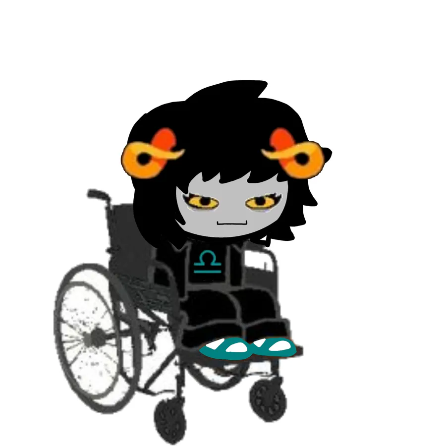 Looks: short black hair, curved inwards horns, wheelchair user, black coat, black shirt with her β sign, socks and teal sandals, black pants.