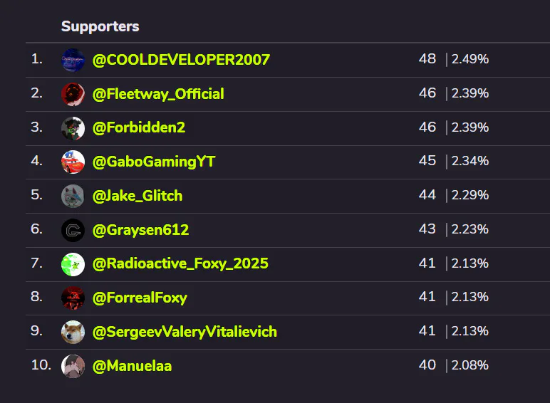 Shoutout to top 10 supporters in October 2025, and thanks everyone for giving charged stickers in the spooky scary month!