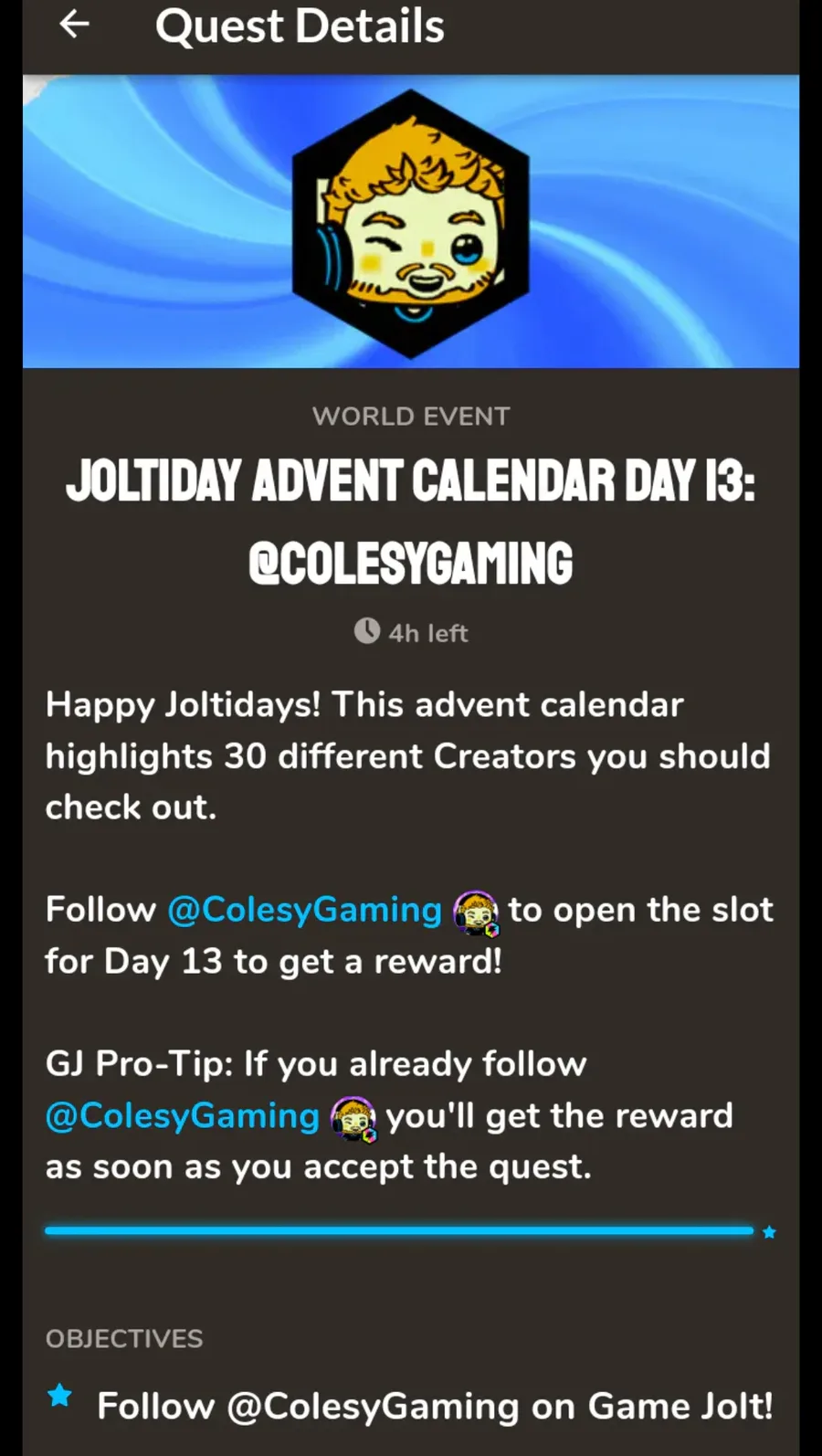 Each Monday in December, you'll get a new Joltidays quest!