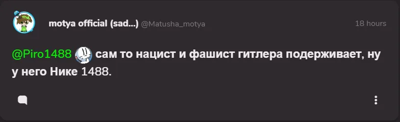 Я не нацист, и не фаш*ст. Раньше, у тебя тоже 1488, был. Закрой ебало, и не выебылайся. Кусок аутизма, мой маленький, сын шлюхи. @Matysha_motya
