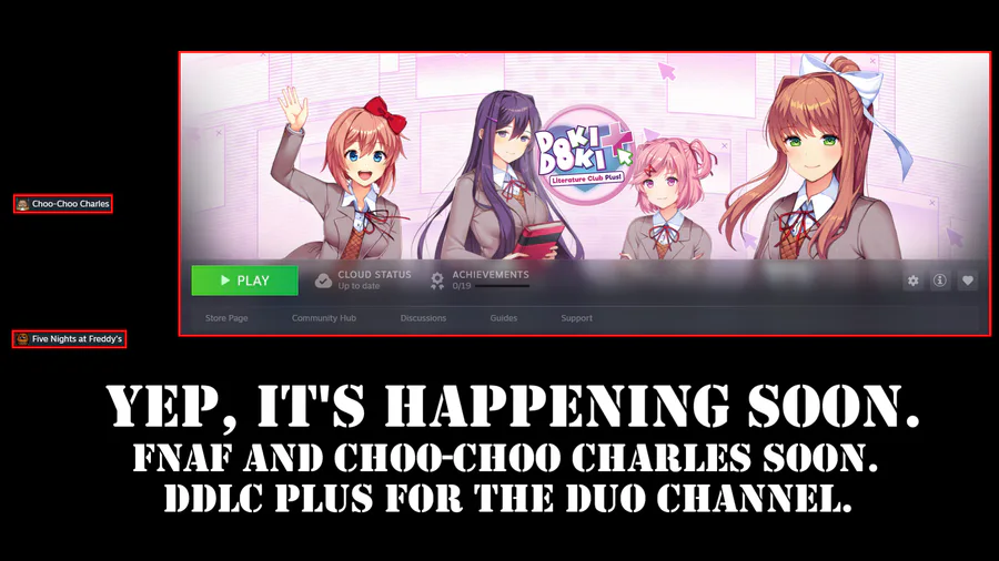 FNAF and Choo-Choo Charles for the main channel. DDLC Plus for the duo channel.