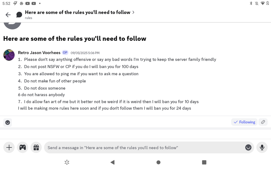 If you are someone who joined or thinks of joining my discord server read the rules first and if you break them I'm ban you for 24 days it's simple really