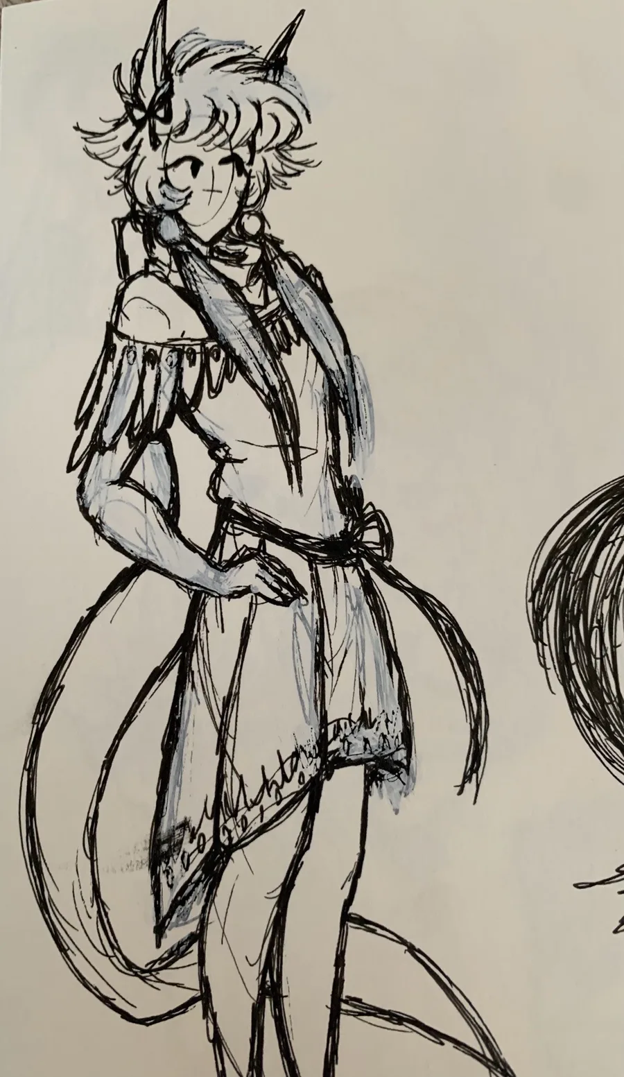 Have sketches of me trying to find outfits for my Origami Cat gijinka and testing design ideas for Black Rabbit/Bonnie Glade’s soul