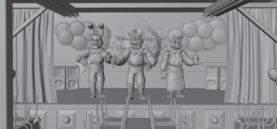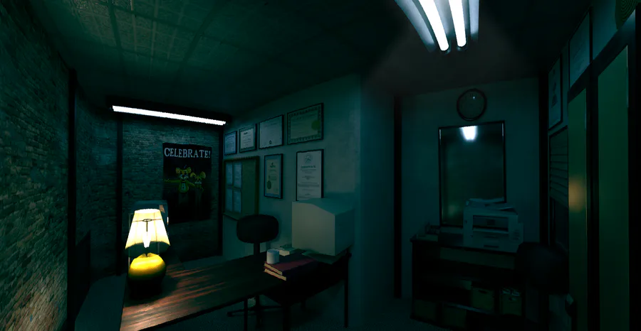 MAIN MENU - (WIP) I plan to add more animatronic characters on each night, along with more human characters/imagery occasionally appearing in the background.