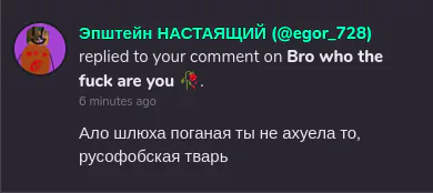 Here is your answer. Comment says, and I quote: "Hello, you filthy whore, aren't you fucking nuts, you Russophobic bitch?"
