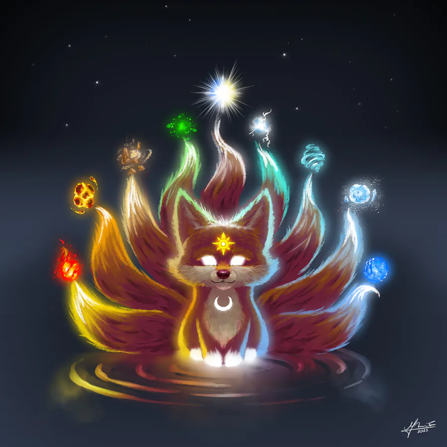 while using her tails as a attack/support, she can use up to 9 elemental attack/support they want on her tails