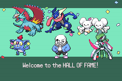 to beat the elite 4 i used a family guy the maushold, roaring moon, iron valiant, ligmibilin, greninja, and the man the myth the legend himself!! sans, sans the skeleton. sans was a roaming legendary in this game