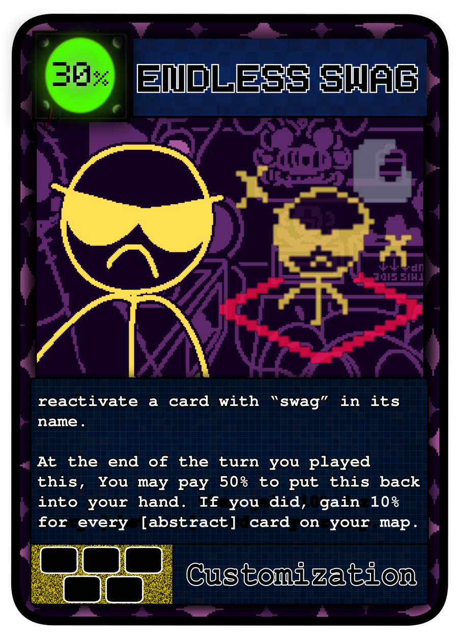 Endless swag- this kinda scary card allows any card with "swag" in their name to reactivate (which swagalicious gives to the card it augments), allowing for it to attack or deactivate for an effect again. it also has an effect where at the end of your turn, you may bring it back to your hand by paying 50%, then you gets 10% for each [abstract] card you have. its secondary effect is heavily supported by the whole abstract playstyle of spamming cheap, weak cards out that flood your board.