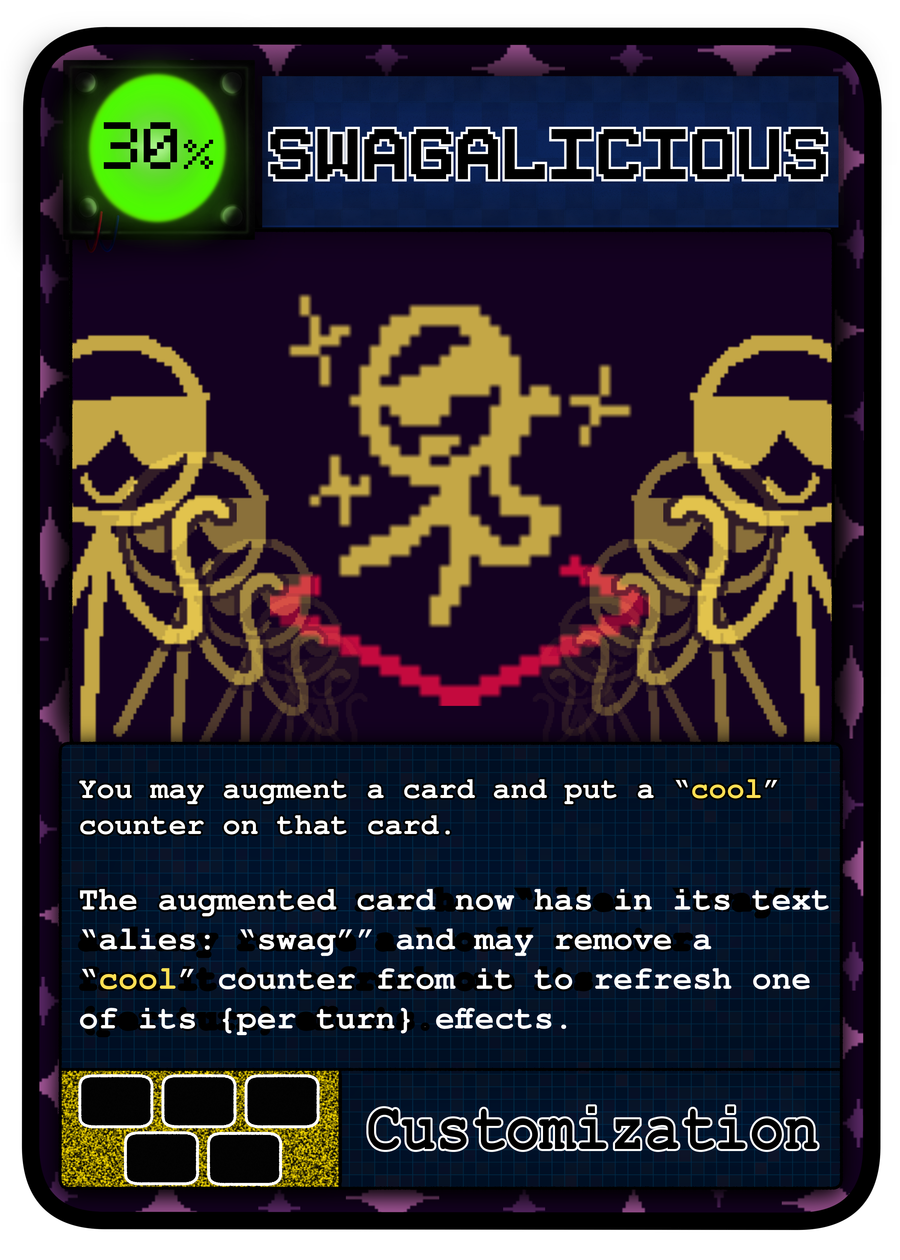 Swagalicious- this card can act as weird support for swagman or for more general use. basically, it first attached/augments itself to a card, giving that card a cool counter. while augmented, the other card has swag in there name and can remove a cool counter to reactivate a once per turn effect. this allows swagman to reuse his once per turn if he has the cool counters to pay for it, or can be put onto any other card to trigger THERE effect another time (thought can only be used once due to the lack of "cool" counters this card gives). this also allows other cards to use...