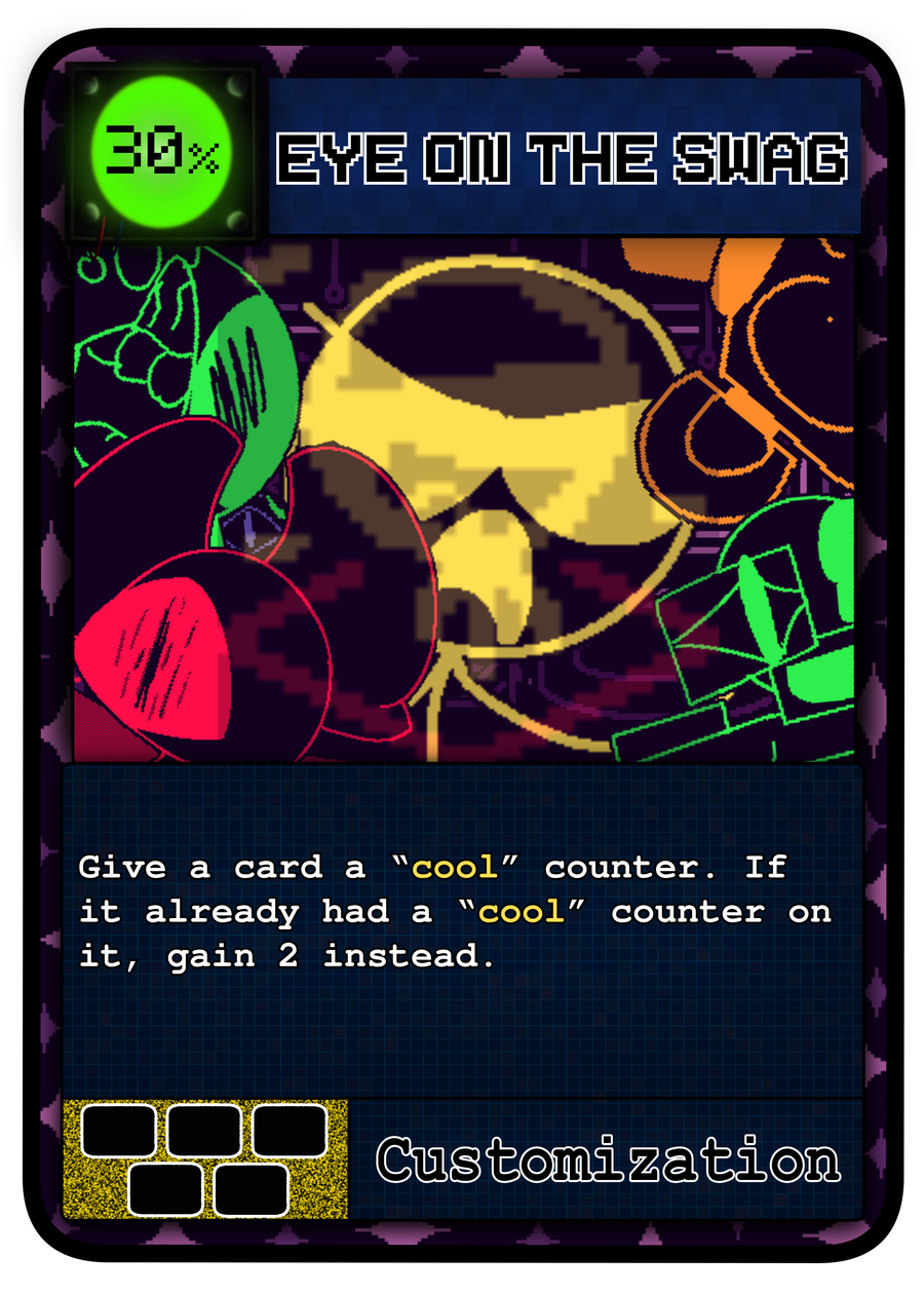 Eye on the swag- for how MUCH is happening on that art, its a pretty simple card. either it gives 1 cool counter to a card, or give 2 if the card already had one. its just an easy way to get cool counters quickly for swagalicious, and can save swagman in a pinch.