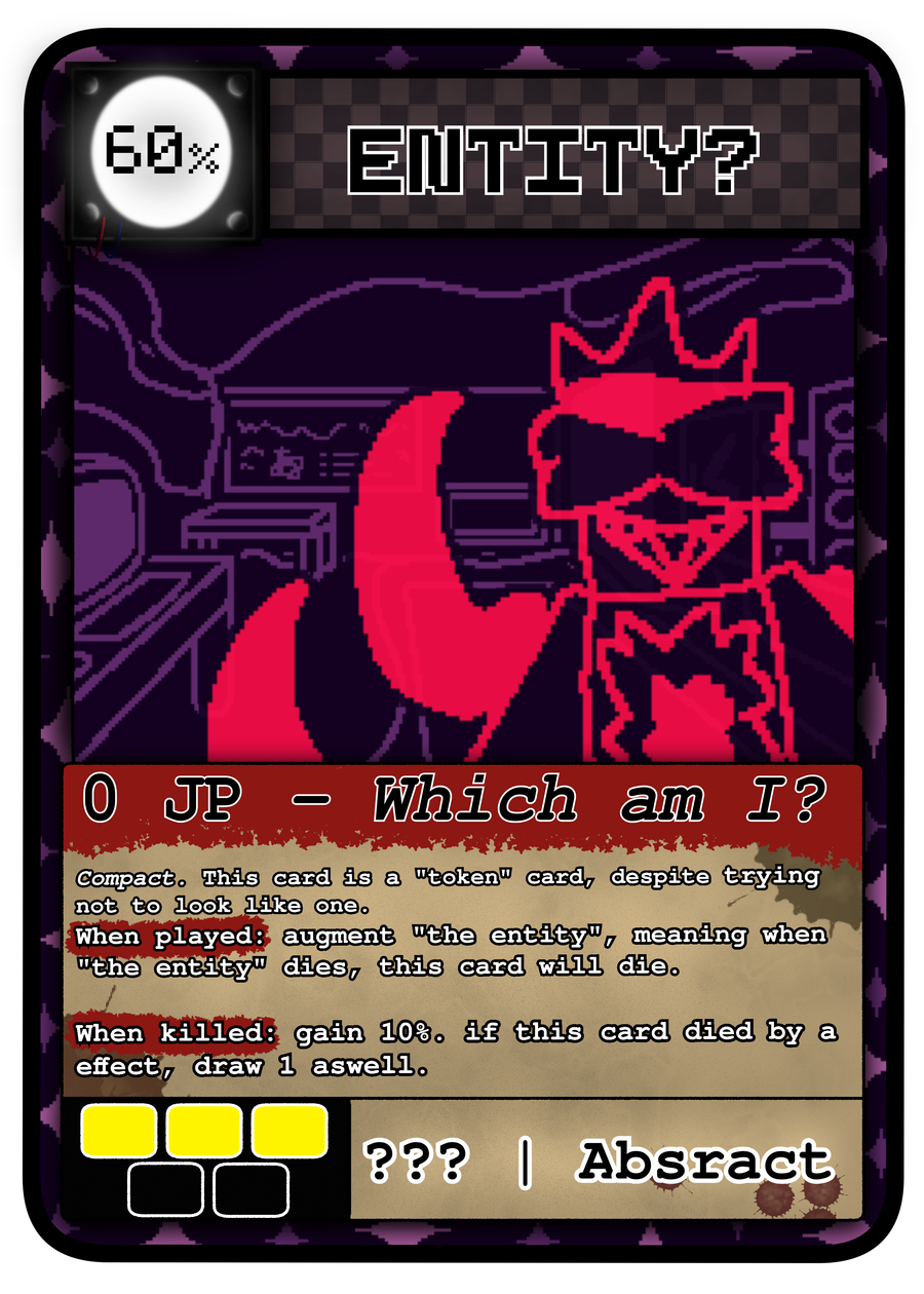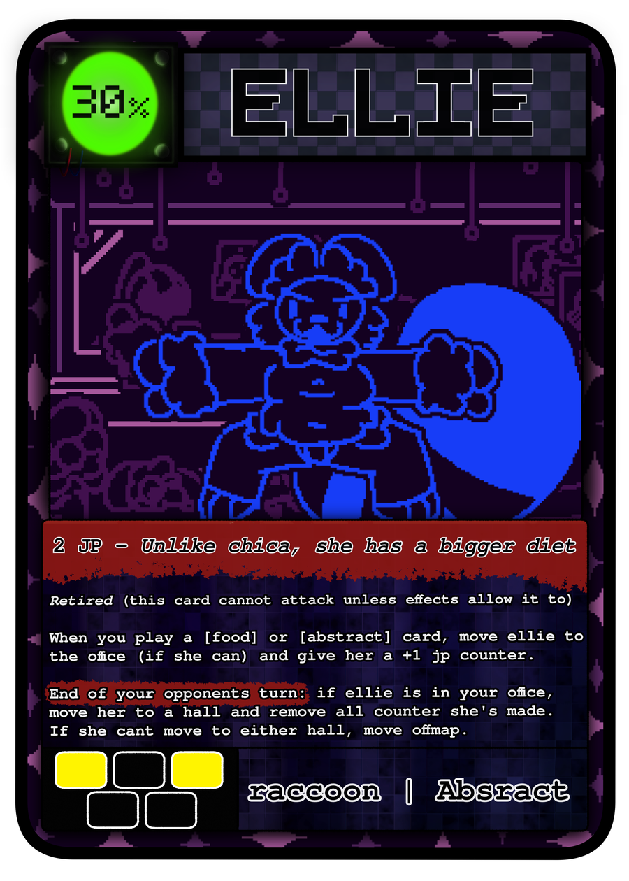 Ellie - this raccoon, quite Franky , i forgot to add into the food themed devlog i had last time, so now she's here! she's a pretty simple defensive card, getting more stronger as you play [food] or [abstract] cards, and running around like a mad women (hopefully didnt get the gender mixed up this time lol)!