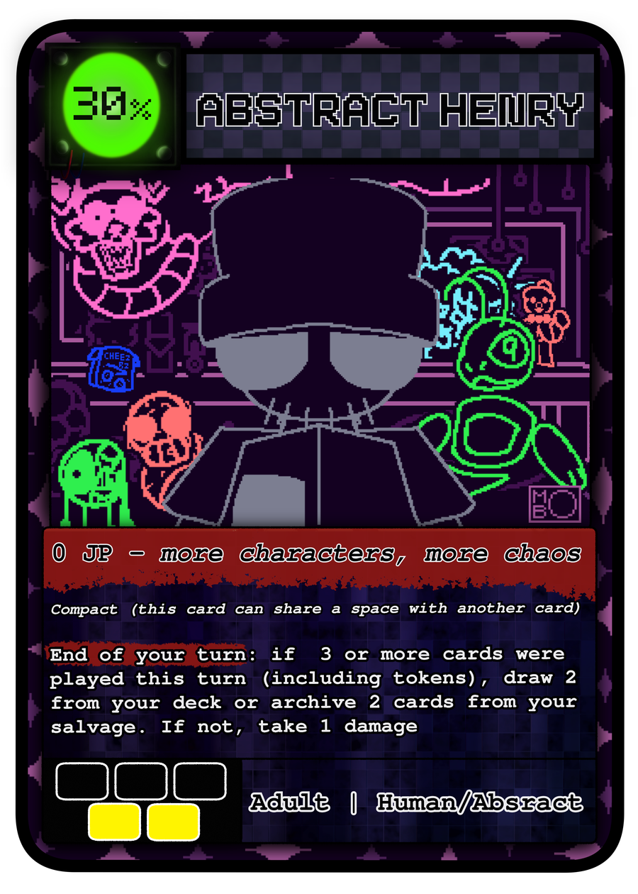 Abstract Henry - henry is also a staple card for the TMN deck, as he can easily help keep you hand healthy by, well drawing more cards! along with that, if you already have too many cards in your hand, he can cycle cards from your salvage back into your deck, just to make sure you dont deckout. thought if you dont play 3 or more cards in a turn, you not only would not get the card draw/cycle, but you also take 1 damage, giving him some risk to have in play.