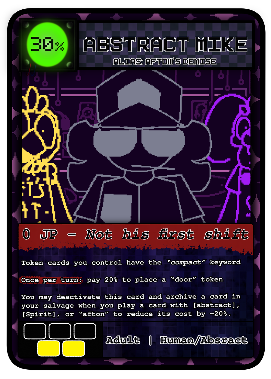 Abstract Mike - mike, quite frankly, is much less risky (just like in-game!). although his door summons (just to make sure you understand, "doors" are just 0 jp tokens that cant attack, in case you were unaware) are more on the expensive side, he does give them, and any other tokens you have, {compact}. he also can reduce the cost of alot of cards by a good 20%, having his inflated door price balance out.