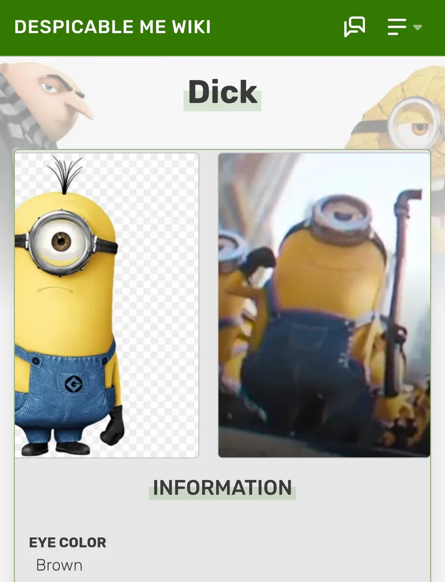 Second Minion I've had to re-name, Harold's page has been deleted from the Despicable Me wiki and has been replaced with a new, officialy named Minion "Dick". Apparently, "Dick" is short for "Richard," but they insist that's his name.
