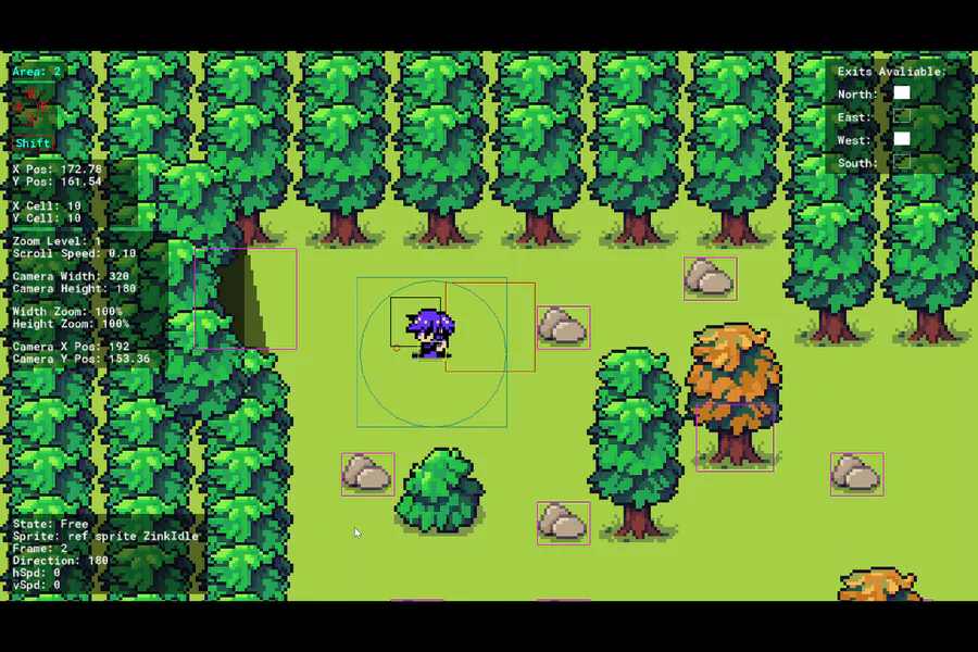 For day 1051 of coding, I had to rearrange some code to have the east and west exits display correctly and accurate for the debug. Now I'll need to look at its player detection