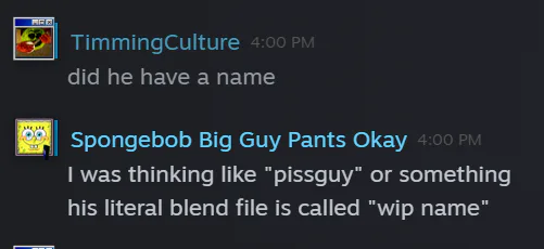 His name was planned to be something like PissGuy and his .blend file name is wip name.