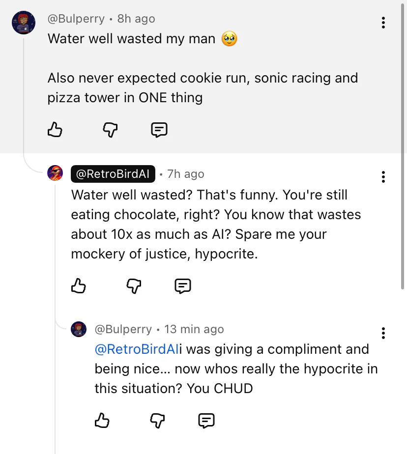 Calling me a hypocrite over a compliment comment only makes them the hypocrite (i didnt know they only made ai slop)