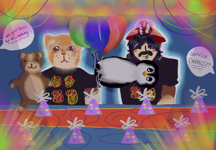 Don't have any new drawings, but here's this digital one I made not too long ago of me and my friend in CHESTER CHEEZ PIZZAAAA (in Roblox)