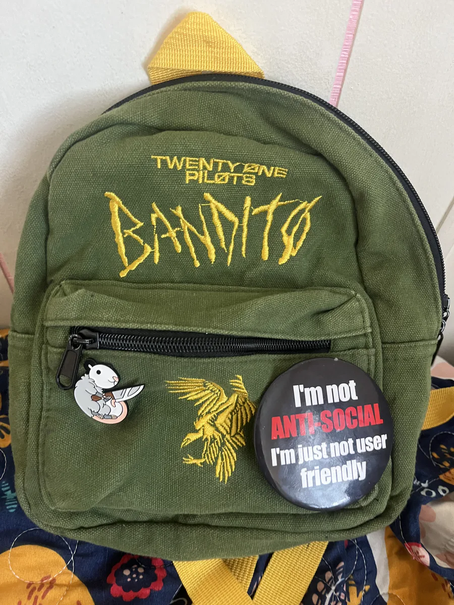 My friend gave me this epic twenty one pilots bag๐๐๐ (I put the pins on it)