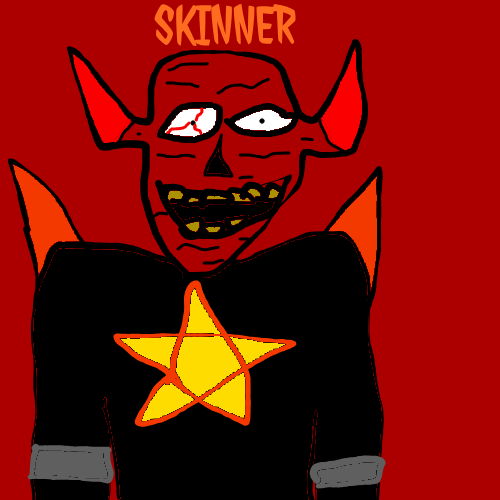 Abel Skinner is a erratic demon bounty hunter guy from the 8th dimension that likes to skin his victims. He used to be a human until his home universe was destroyed by Sumthing's sneeze. He can control souls and laughs a lot for no reason. He gets more powerful the more he makes people or higher beings bleed. He faced Sumbudy and Sum1 when they lost most of their powers because he was contracted to by another demonic higher being. He later became a temporary ally to them until he betrayed them and put them in a 8th dimensional hell.