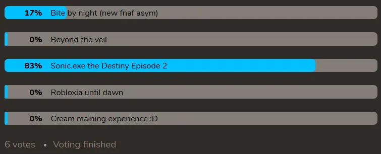 Welp, looks like Sonic exe the destiny wins so the video will be out tomorrow (Saturday) and its going to be full gameplay of me playing it so yeah see you tomorrow. ____. Edit: It's in Premieres right now btw)