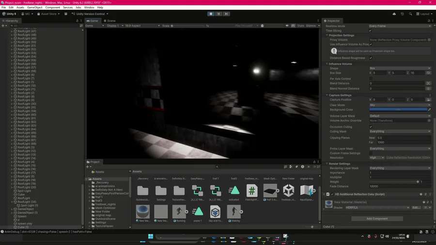 Hi, sorry for the inactivity. I've been trying to fix the animatronics' AI; I'm almost there, but it's not quite there yet. I'm also testing dynamic reflections, but I think I'll discard them due to performance issues.