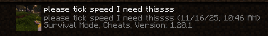 my high tick speed world (tick speed as in like speed the ticks pass not randomtickspeed I have a mod that makes everything faster)