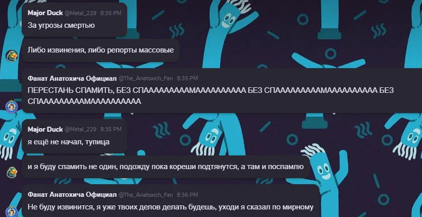 Угрозы смертью, неадекватное поведение, оскарбления, защита тех, кто проебался и уёбичный характер