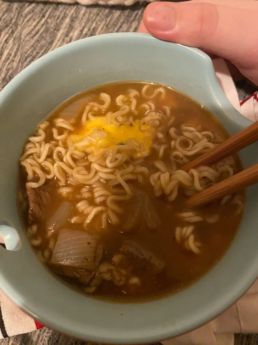 Eating Ramen And,Steak Meat Bites.
