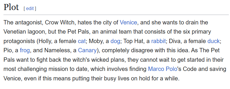 i'm crying the plot is basically a racist witch holds some form of grudge towards venice and the only people who can kill her are six animals