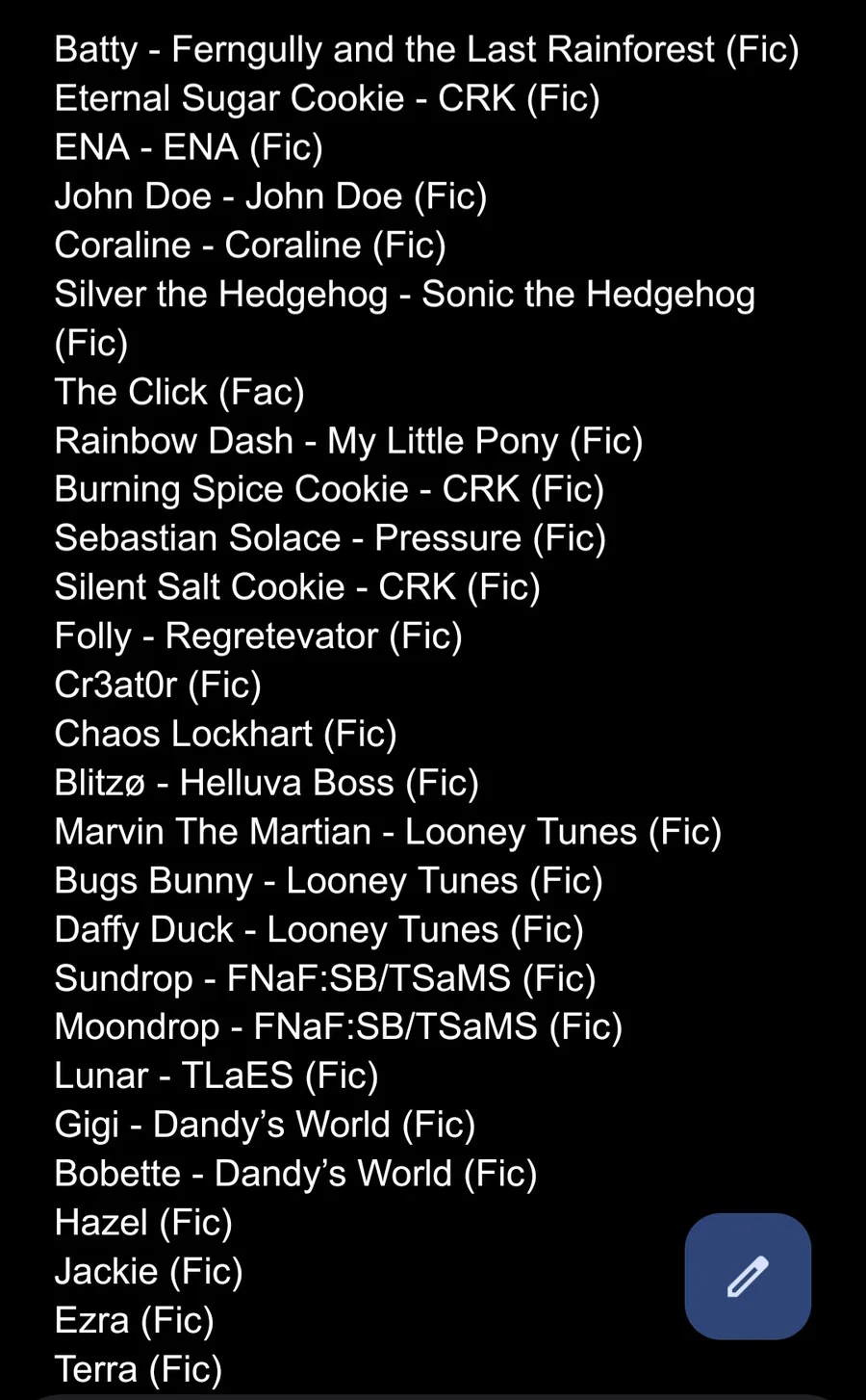 heres all my fictives and factives that i remember rn (theres also Phanuel but i havent added her yet)