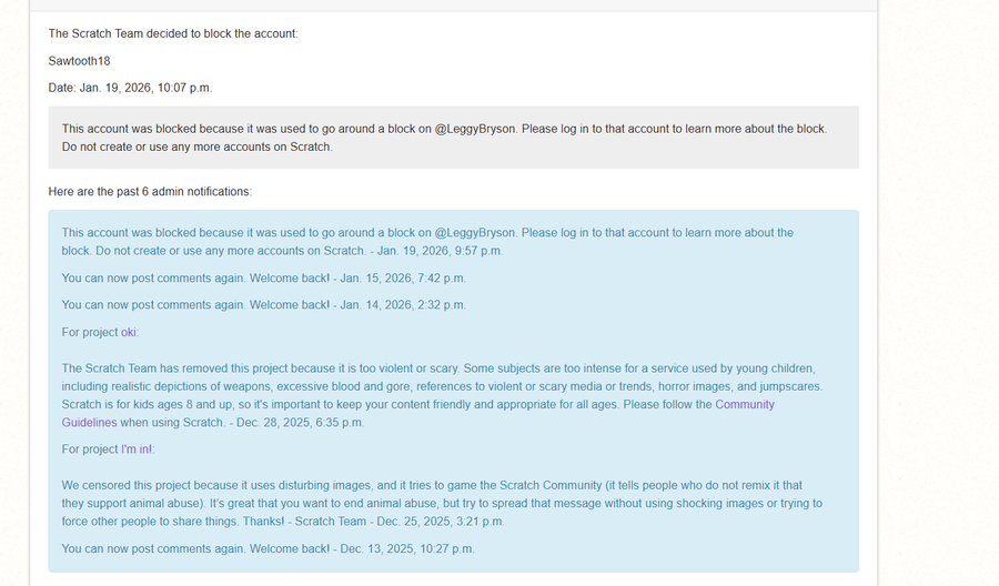 Because I was going around a block, and log in to THAT acc, but it's blocked! So what? I can't! There are many people who are WAY worse, and yet they are STILL on Scratch.