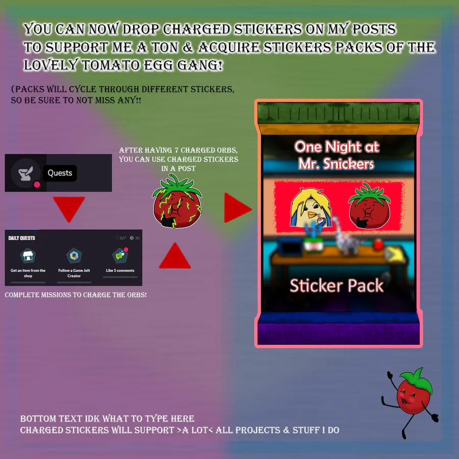 I'm officially a Game Jolt Creator!! That meansss y'all can now place (free!!) Charged Stickers on any of my posts in order to support me & get fun lil' stickers, now currently from the funny tomato egg characters, made by yours truly, who you all came to love and care dearly for! (...right??)