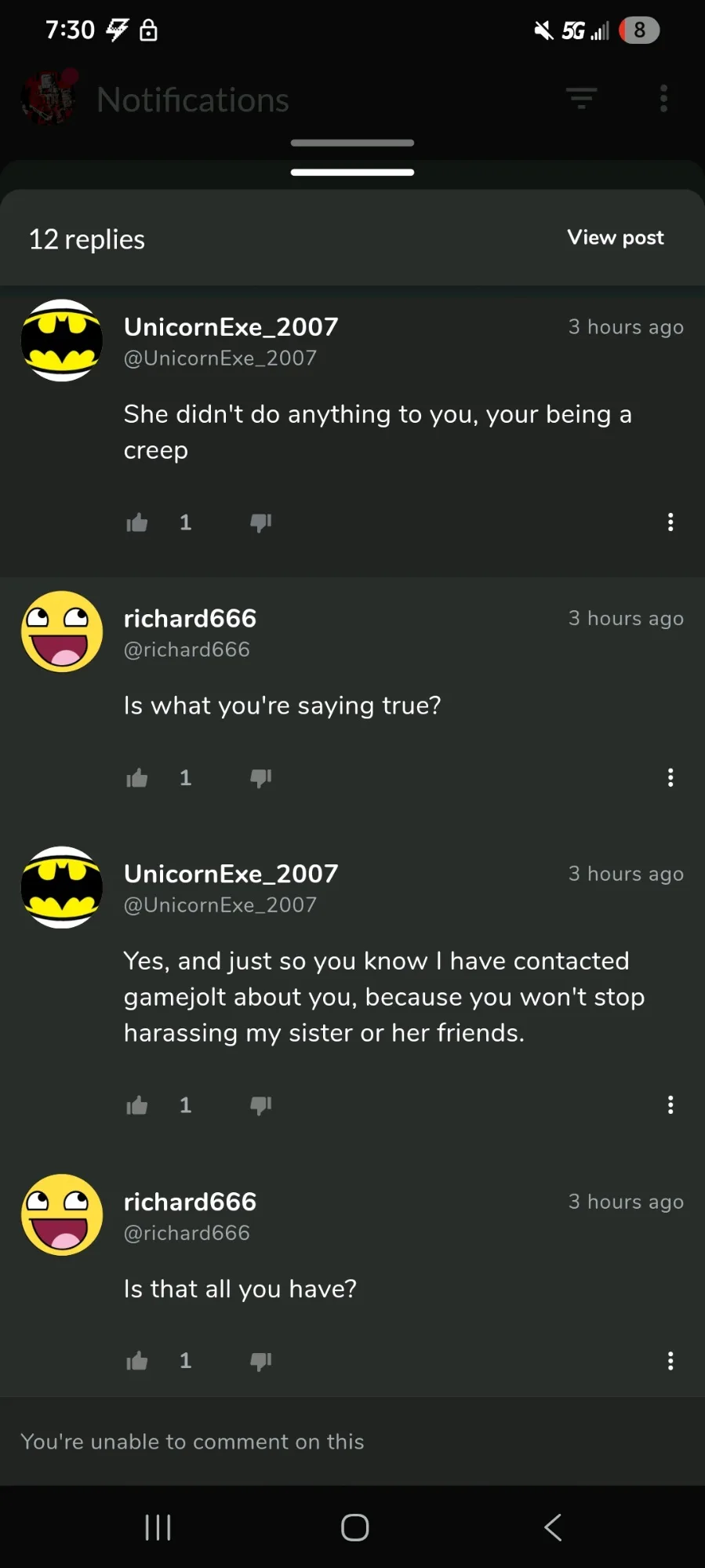 He is harassing one of my friends again.