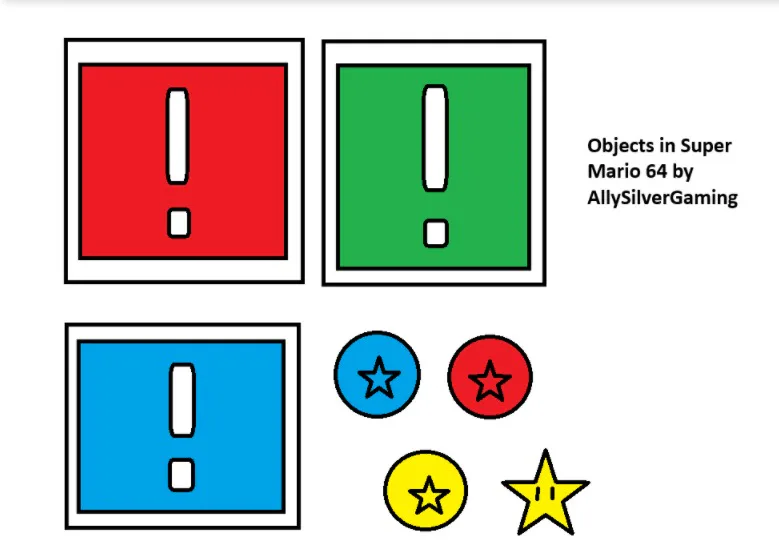 I draw some of the most Iconic Super Mario 64 Objects: Red, Blue and Yellow Coins, Super Star, Metal Cap, Vanish Cap and Wing Cap Boxes